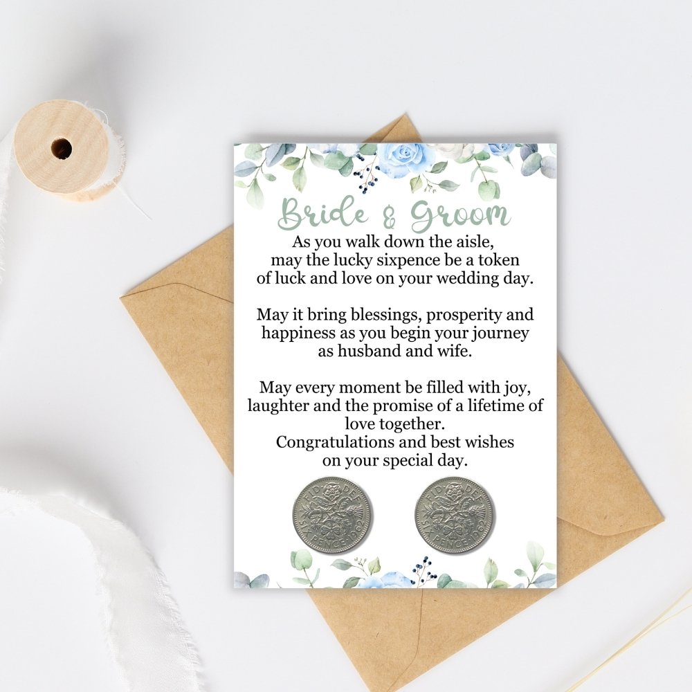 This thoughtful keepsake includes two original sixpence coins – one for the bride and one for the groom – making it a lovely way to honour wedding traditions and mark such a special occasion.